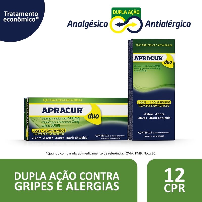 Apracur Duo é um medicamento formulado para proporcionar alívio rápido e eficaz dos sintomas associados às gripes e resfriados, como dores de cabeça, febre, coriza e desconfortos alérgicos. Sua ação é resultado da combinação de três princípios ativos: dipirona, maleato de clorfeniramina e cafeína, que atuam em sinergia para combater os sintomas com segurança e eficiência.