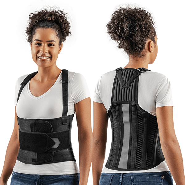 Solte os fechos aderentes das faixas elásticas, das tiras do ombro e das abas em neoprene. Vista o produto. Insira as mãos nos bolsos de ajuste, de forma que facilite o fechamento, transpassando as mãos sobre o abdômen. Ajuste as duas faixas elásticas externas. Corrija a postura, posicionando os ombros para trás. Ajuste as tiras dos ombros e fixe-as nos fechos aderentes.