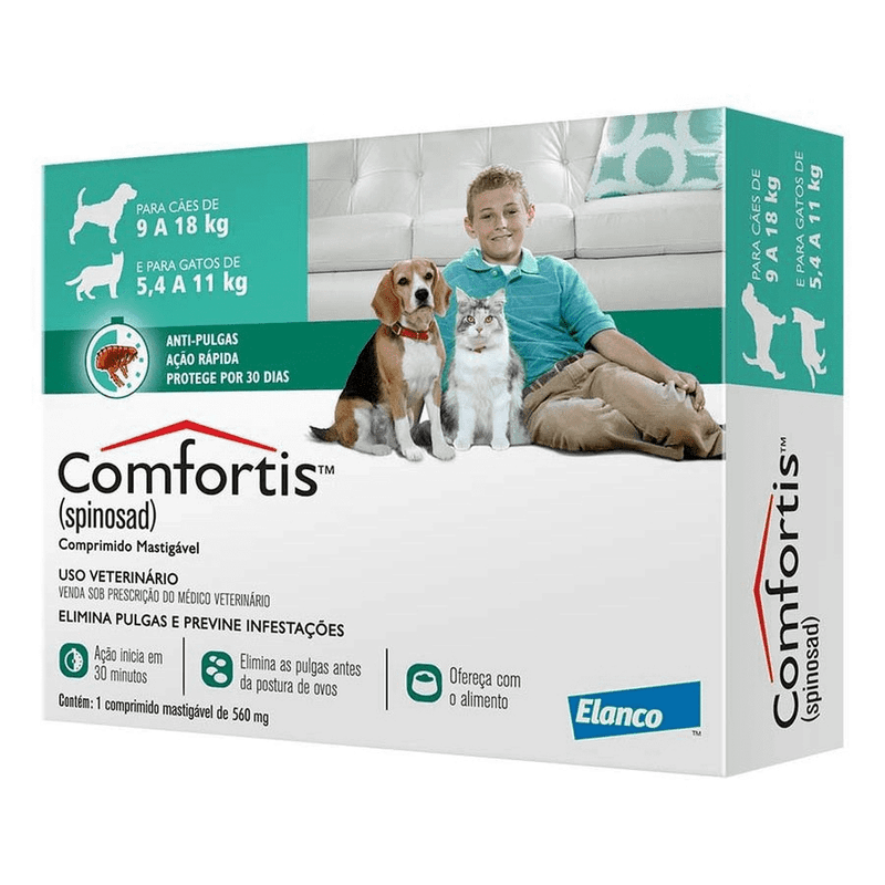 Tratamento e prevenção das infestações por pulgas (Ctenocephalides felis) por um mês em cães adultos e filhotes a partir de 14 semanas de idade e com 2,3 kg de peso corporal ou mais, e gatos adultos e filhotes a partir de 14 semanas de idade e com 1,4 kg de peso corporal ou mais. Comfortis™ deve ser administrado em intervalos mensais. Comfortis™ começa a matar as pulgas de cães e gatos a partir de 30 minutos. O tratamento pode ser iniciado em qualquer época do ano, preferencialmente se iniciando um mês antes das pulgas se tornarem ativas e continuando mensalmente até o final da estação das pulgas. Em áreas onde as infestações de pulgas se dão o ano inteiro, o tratamento mensal deve ser contínuo o ano todo, sem interrupções.
