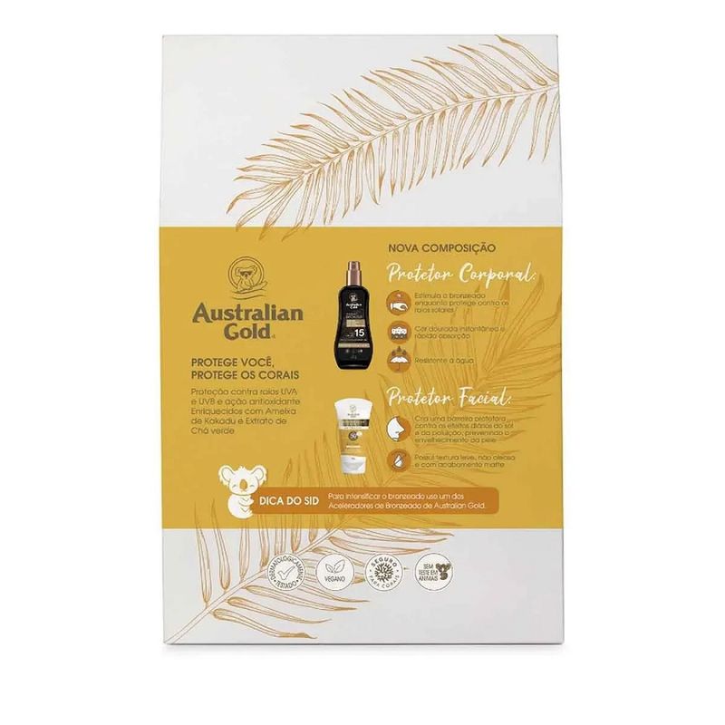 O Kit Australian Gold Protetor Solar Corporal FPS 15 Spray Gel 235g + Facial FPS 50 Gel Creme 50g é uma mistura perfeita e recomendada para um belo dia de sol com segurança e adquirir um bronzeado ideal e esperado. O Protetor Solar Corporal Australian Gold Spray Gel, é um bronzeador corporal composto pela tecnologia Biosine Complex, com fácil absorção na pele e cheiro agradável após a aplicação, garantindo então um bronzeado ideal e seguro. Por outro lado, o Protetor Solar Facial Australian Gold Gel Creme garante proteção ideal contra a incidência dos raios solares UVA e UVB de modo seguro e essencialmente vegano, sem poluição. Sua composição se dar por meio da presença de Chá Verde, cujo efeito age como antioxidante e anti-inflamatório. Não perca essa chance e adquira já o seu!