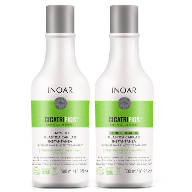- Condicionador Inoar Cicatrifios (500ml): Sela as cutículas, hidrata e potencializa a recuperação dos fios.