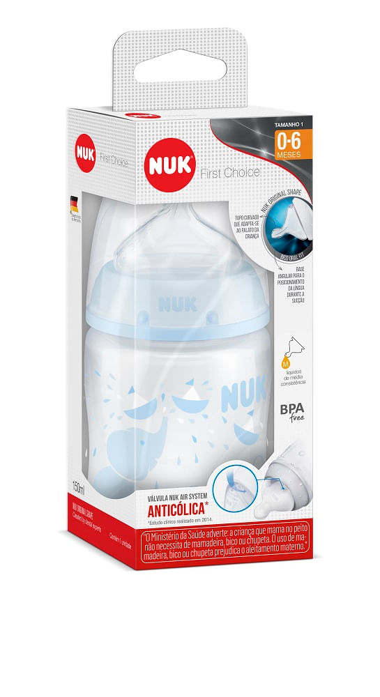A Mamadeira NUK First Choice com sistema Air system anticólica que reduz a formação e ingestão de bolhas de ar durante a alimentação e possibilita um fluxo constante de líquido para que a criança se alimente de forma contínua, diminuindo os riscos de cólicas.