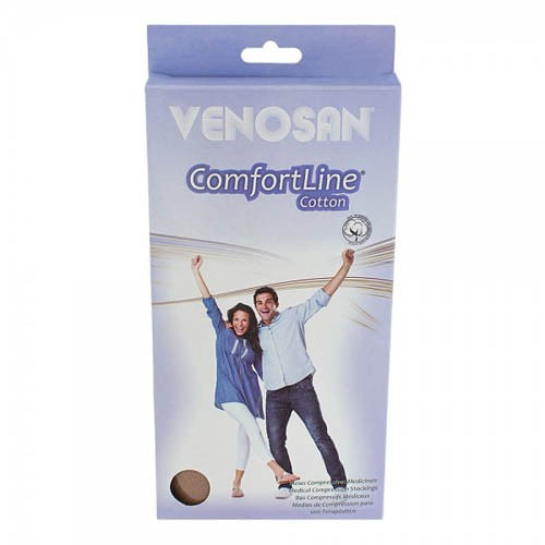 A Meia Venosan ComfortLine Cotton de média compressão, 20-30mmHg, é indicada para tratamentos relacionados à circulação sanguínea. Composta por poliamida, algodão e elastano, tem 100% de algodão em contato com a pele e ajuda a aliviar a sensação de peso e fadiga nas pernas.