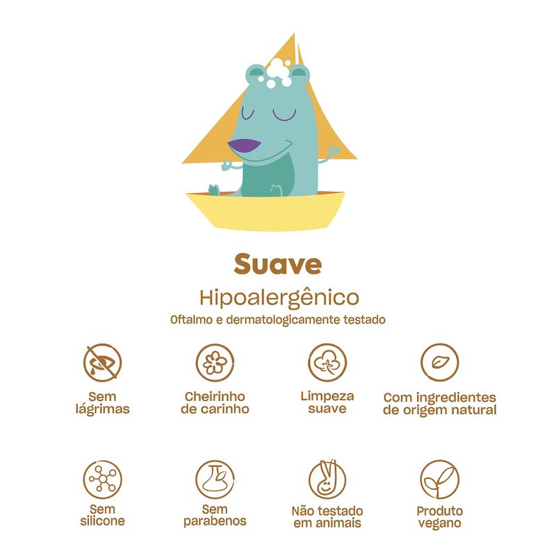 Molhe os cabelinhos do bebê e aplique uma pequena quantidade do shampoo nas mãos. Massageie delicadamente até formar espuma e enxágue completamente. Use diariamente ou sempre que necessário, garantindo uma limpeza suave e segura.