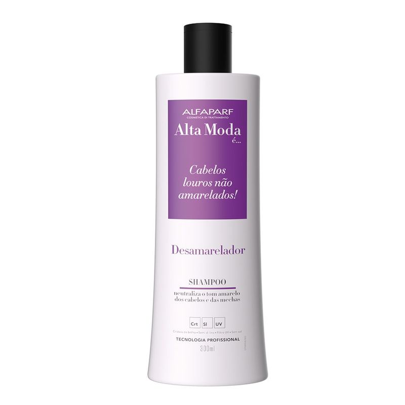 O Shampoo Alta Moda Desamarelador proporciona limpeza delicada e eficaz, além de promover aos fios brilho e uma sensação de refrescância. Desenvolvido especialmente para cabelos louros, com mechas ou luzes. Sua fórmula possui cristais de brilho, pigmentos violeta micronizados, semi di lino e filtro solar que neutraliza o tom amarelado e proporciona brilho aos fios. Cabelos louros não amarelados!