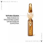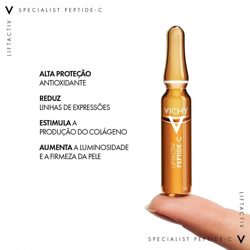 Vichy Liftactiv Specialist Peptide-C Ampolas Antienvelhecimento traz uma combinação inédita, capaz de agir em várias dimensões para estímulo e defesa do colágeno na pele. Sua formulação com 10% de vitamina C pura, duplo ácido hialurônico de origem natural, água vulcânica de Vichy e o grande diferencial, complexo de biopepitídeos. Biopeptídeos são micropartículas de proteína, capazes de aderir mais facilmente ao colágeno, proteína presente no organismo humano, que com o passar da idade têm sua produção reduzida. Além da diminuição natural, existem outros fatores ligados que intensificam a queda na sua produção, entre eles alterações hormonais, no sono, estresse e má alimentação.
